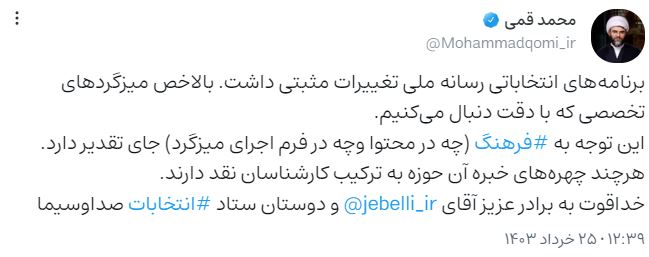 برنامه‌های انتخاباتی رسانه ملی تغییرات مثبتی داشت. بالاخص میزگردهای تخصصی که با دقت دنبال می‌کنیم.این توجه به فرهنگ (چه در محتوا وچه در فرم اجرای میزگرد) جای تقدیر دارد. هرچند چهره‌های خبره آن حوزه به ترکیب کارشناسان نقد دارند.خداقوت به برادر عزیز آقای ‎@jebelli_ir و دوستان ستاد انتخابات صداوسیما