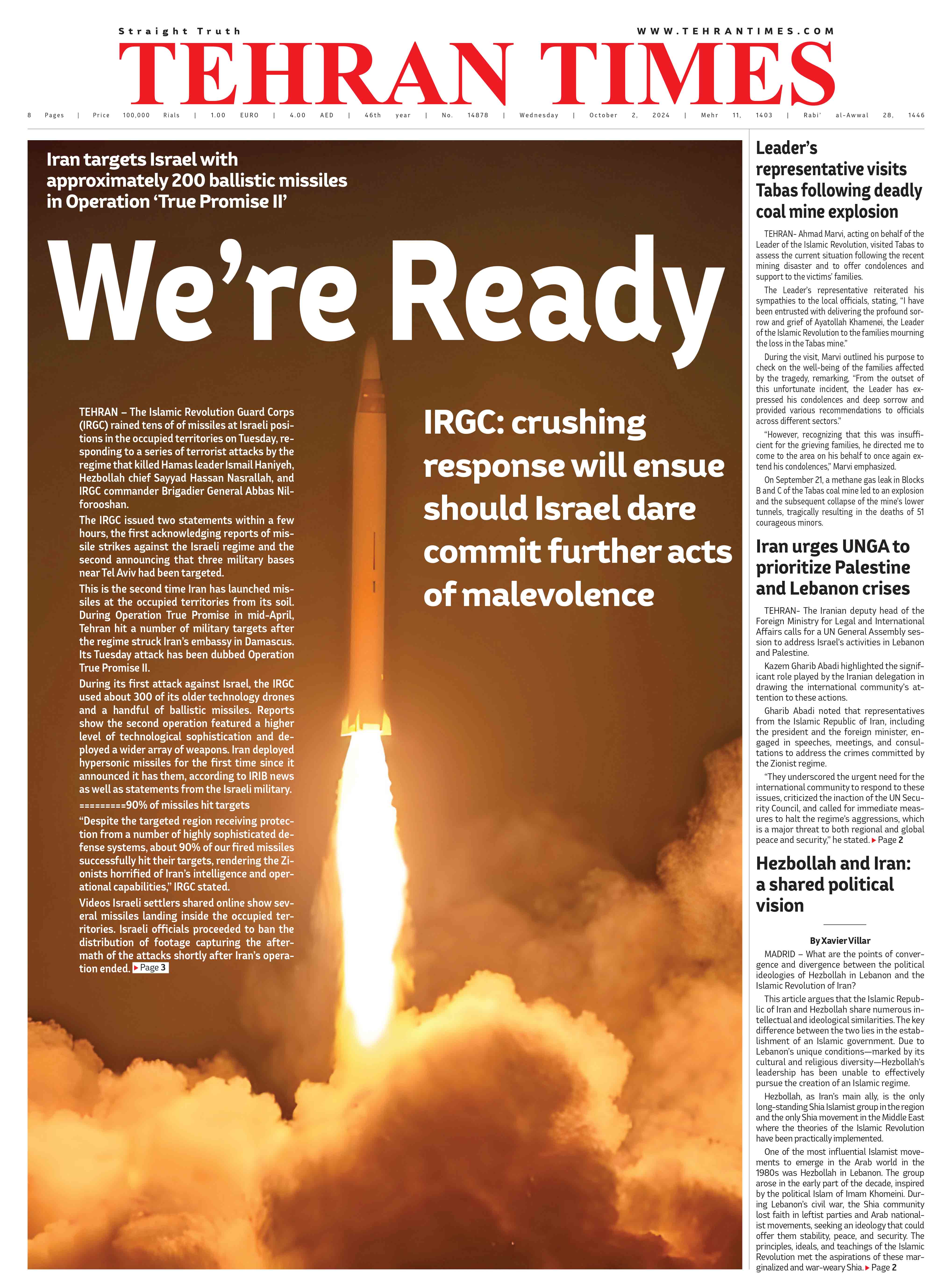 گروه رسانهای مهر | «ما آمادهایم» تیتر یک روزنامه انگلیسی زبان تهران تایمز