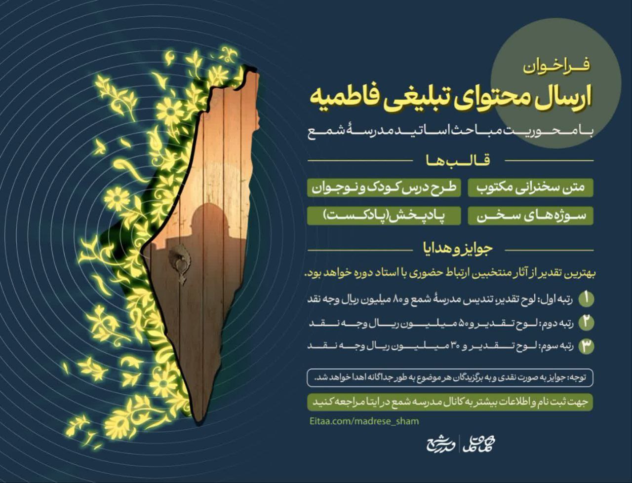 اکنون فراخوان ارسال محتوای تبلیغی فاطـمیه با محوریت مباحث مدرسهٔ شمع منتشر شده است. علاقهمندان میتوانند در قالبهای متن سخنرانی مکتوب، سوژههای سخن، طرح درس کودک و نوجوان . پادکست محتوای تولیدی خود را به کانال مدرسه شمع در ایتا به آدرس: Eitaa.com/madrese_sham ارسال کنند.