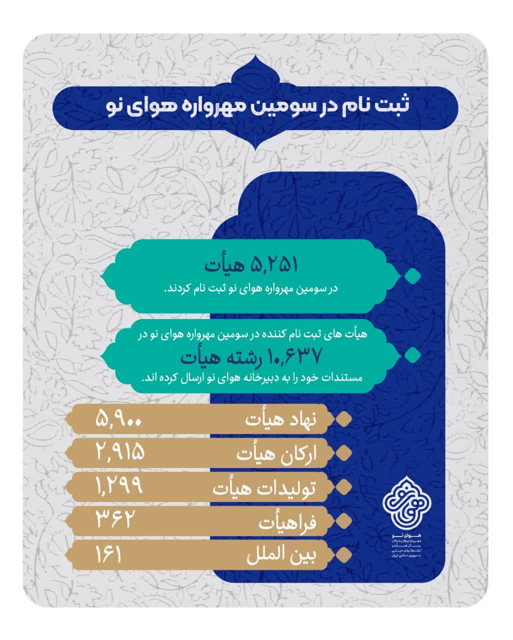 هیئات شرکت‌کننده در سومین دوره «مهرواره هوای نو» که در پنج بخش «نهاد هيأت»، «ارکان هيأت»، «توليدات هيأت»، «فرا هيأت» و «بین‌الملل» به رقابت پرداختند، به عدد ۵ هزار ۲۵۱ هيأت رسیدند.