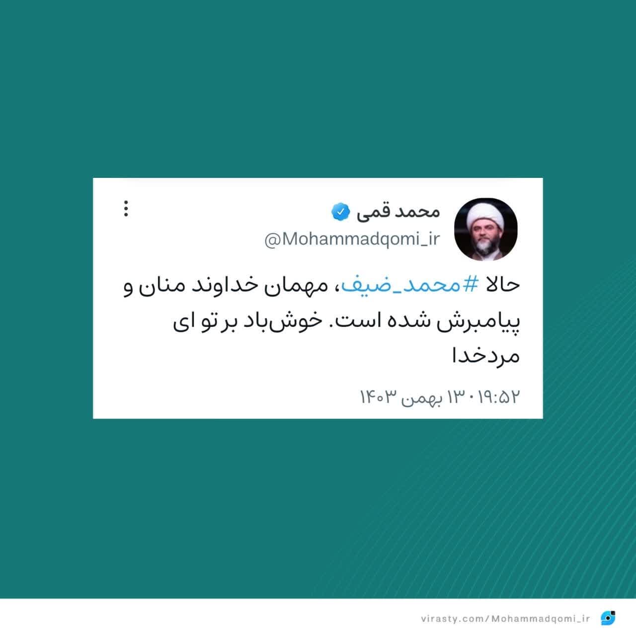 حالا محمد ضیف، مهمان خداوند منان و پیامبرش شده است. خوش باد بر تو ای مرد خدا.