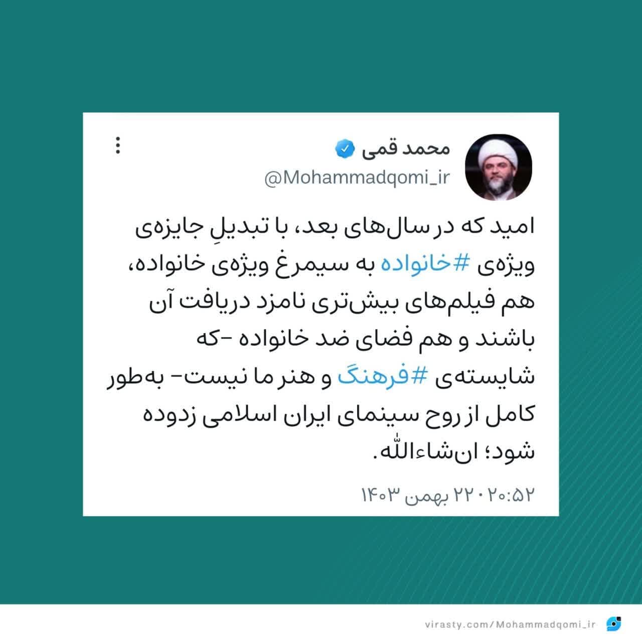 به گزارش روابط عمومی سازمان تبلیغات اسلامی، حجت‌الاسلام محمد قمی، رئیس سازمان تبلیغات اسلامی، همزمان با اختتامیه‌ی چهل‌ و‌ سومین دوره‌ی جشنواره‌ی فیلم فجر، با تمجید از جایزه‌ی ویژه‌ی خانواده و توجه به آن، در خصوص لزوم ارتقای فضای فرهنگی سینمای ایران و اهتمام بیشتر نسبت به مسئله‌ی خانواده ابراز امیدواری کرد.