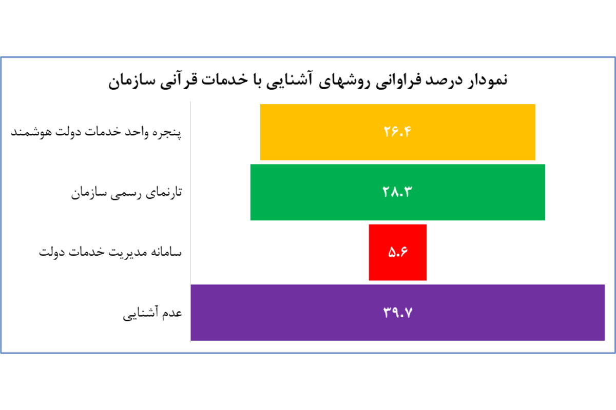 نتایج حاصل از سوال "آشنایی شما با خدمات قرآنی سازمان تبلیغات اسلامی از چه طریقی بوده است؟" حاکی از تثبیت خدمات الکترونیک سازمان در پنجره واحد خدمات دولت هوشمند و همچنین میزخدمت الکترونیک تارنمای رسمی سازمان به عنوان درگاههای ارائه خدمات الکترونیک به کاربران میباشد. در خصوص آشنایی هر چه بیشتر کاربران با خدمات قرآنی سازمان نیز میبایست نسبت به تبیین و اطلاعرسانی در خصوص تنوع خدمات قرآنی قابل ارائه به مخاطبین تصمیمات متقضی اتخاذ و اجرایی شود.