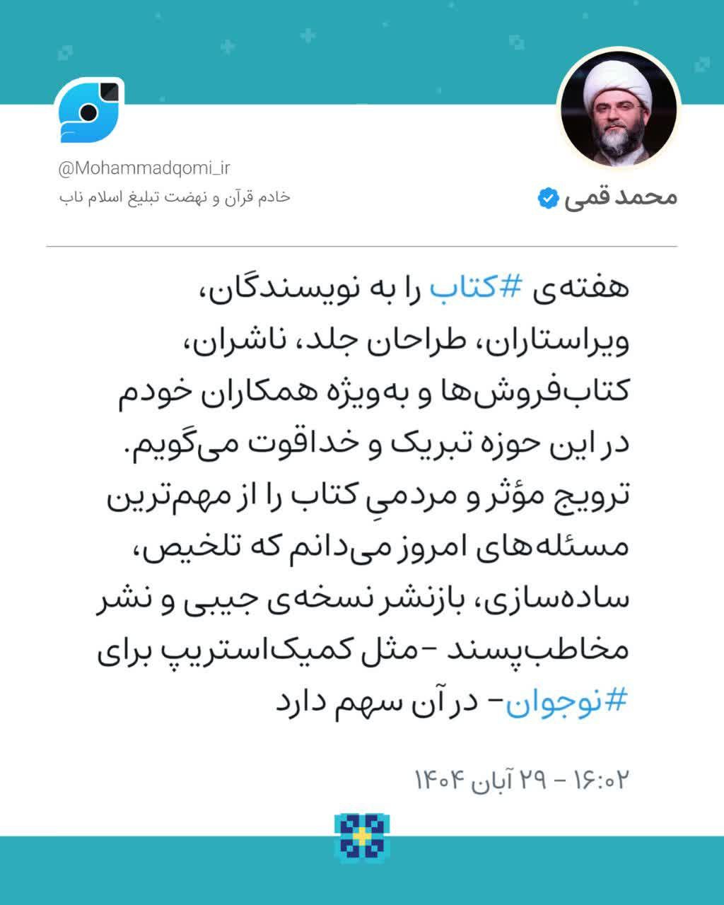 ۲۹ آبان | حجت‌الاسلام قمی به مناسبت هفته کتاب نوشت؛