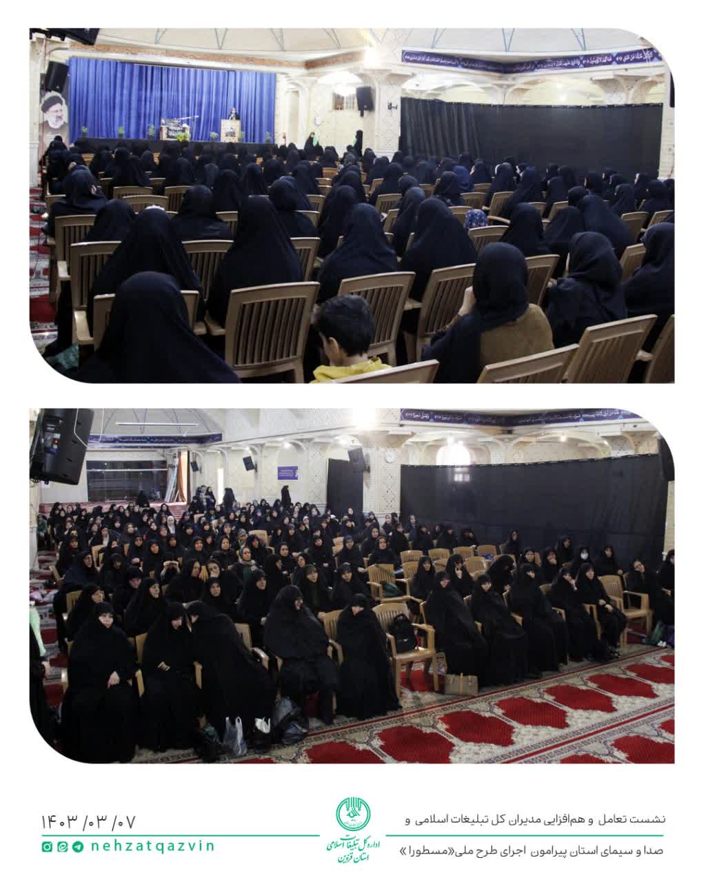مراسم گرامیداشت پنجمین روز شهادت سید شهیدان خدمت آیت الله رئیسی و همراهان ایشان در قزوین (ویژه بانوان) مراسم بزرگداشت رئیس جمهور شهید و هیئت همراه او صبح روز دوشنبه هفتم خرداد در شبستان امیرالمومنین مسجدالنبی، با حضور بانوان قزوینی برگزار شد.