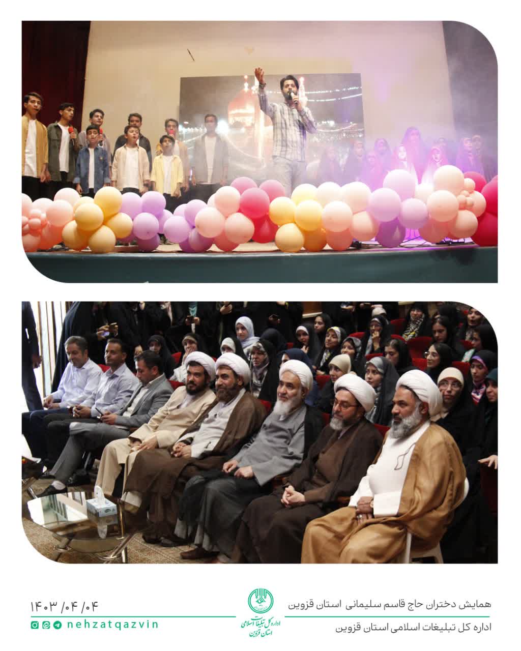 همایش بزرگ دختران حاج قاسم سلیمانی استان قزوین ویژه رای اولی ها همایش بزرگ رأی اولی ها ویژه دختران حاج قاسم در استان قزوین روز دوشنبه چهارم تیرماه باحضور بیش از 800 نفر از دانش آموزان دختر رأی اولی ، آیت الله عابدینی نماینده محترم ولی فقیه در استان و امام جمعه قزوین و حجتالاسلام عزتزمانی معاون امور فرهنگی و تبلیغ سازمان تبلیغات اسلامی و سایر مسئولین در سالن اجتماعات اداره کل تبلیغات اسلامی برگزار شد. .