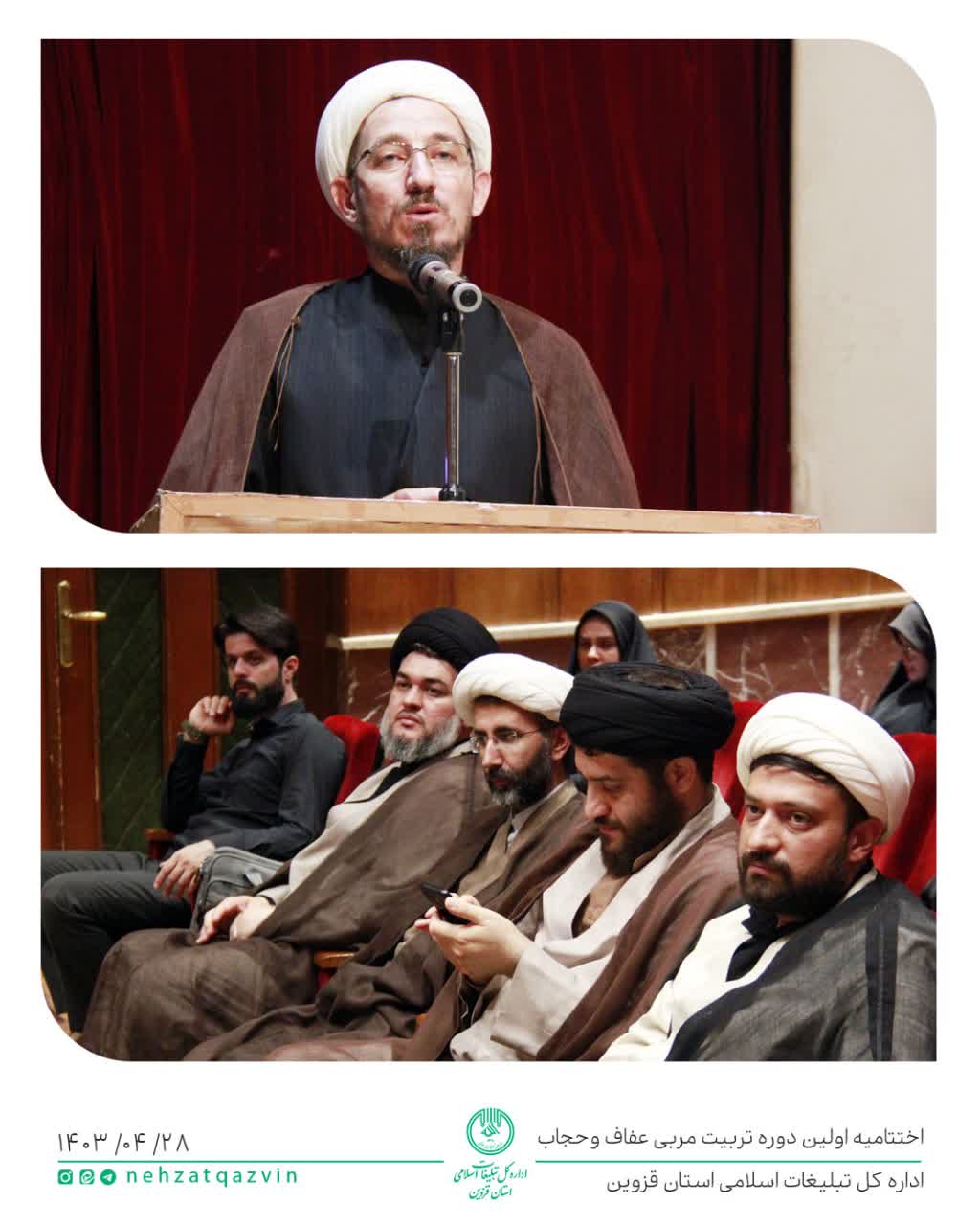 اختتامیه اولین دوره استانی تربیت مربی عفاف و حجاب در استان قزوین اولین دوره استانی تربیت مربی عفاف و حجاب در استان قزوین روز پنجشنبه بیست هشتم تیر ماه به مدت یک روز در اداره کل تبلیغات اسلامی استان قزوین به کار خود پایان داد. این دوره جامع به صورت حضوری و با حضور اساتید کشوری و یکصد نفر از مبلغات برگزار شد. اصول شخصیت زن از منظر اسلام،الزامات فقهی و حقوقی حجاب و شبهات آن،مبانی فکری غرب در نگرش به زن،نسبت دولت به حجاب،خاستگاه حجاب از منظر دین و روانشناسی،از مباحث آموزشی این دوره بود.
