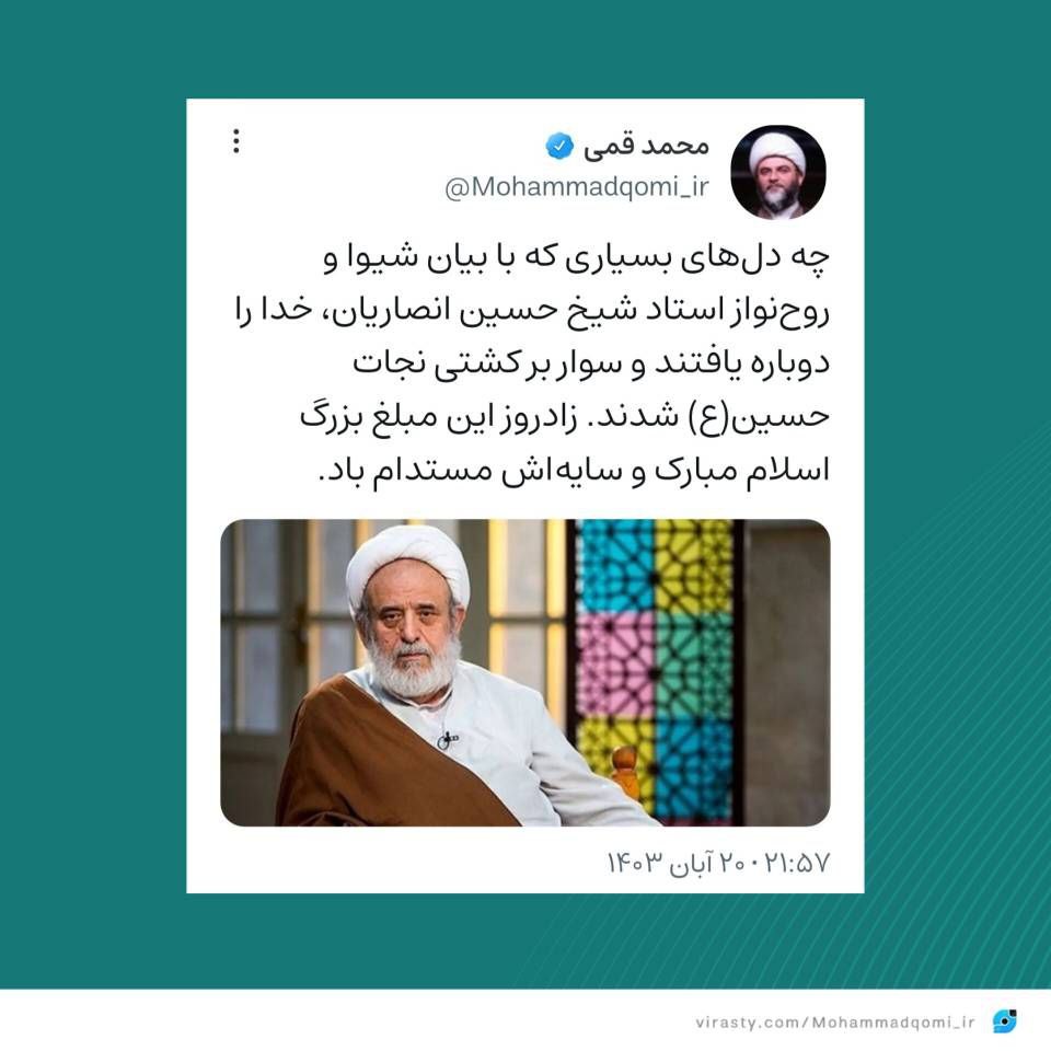 به گزارش روابط عمومی سازمان تبلیغات اسلامی، حجتالاسلام محمد قمی، رییس سازمان تبلیغات اسلامی، در صفحه شخصی خود در شبکه اجتماعی ویراستی، به مناسبت زادروز استاد شیخ حسین انصاریان متنی را منتشر کرد.