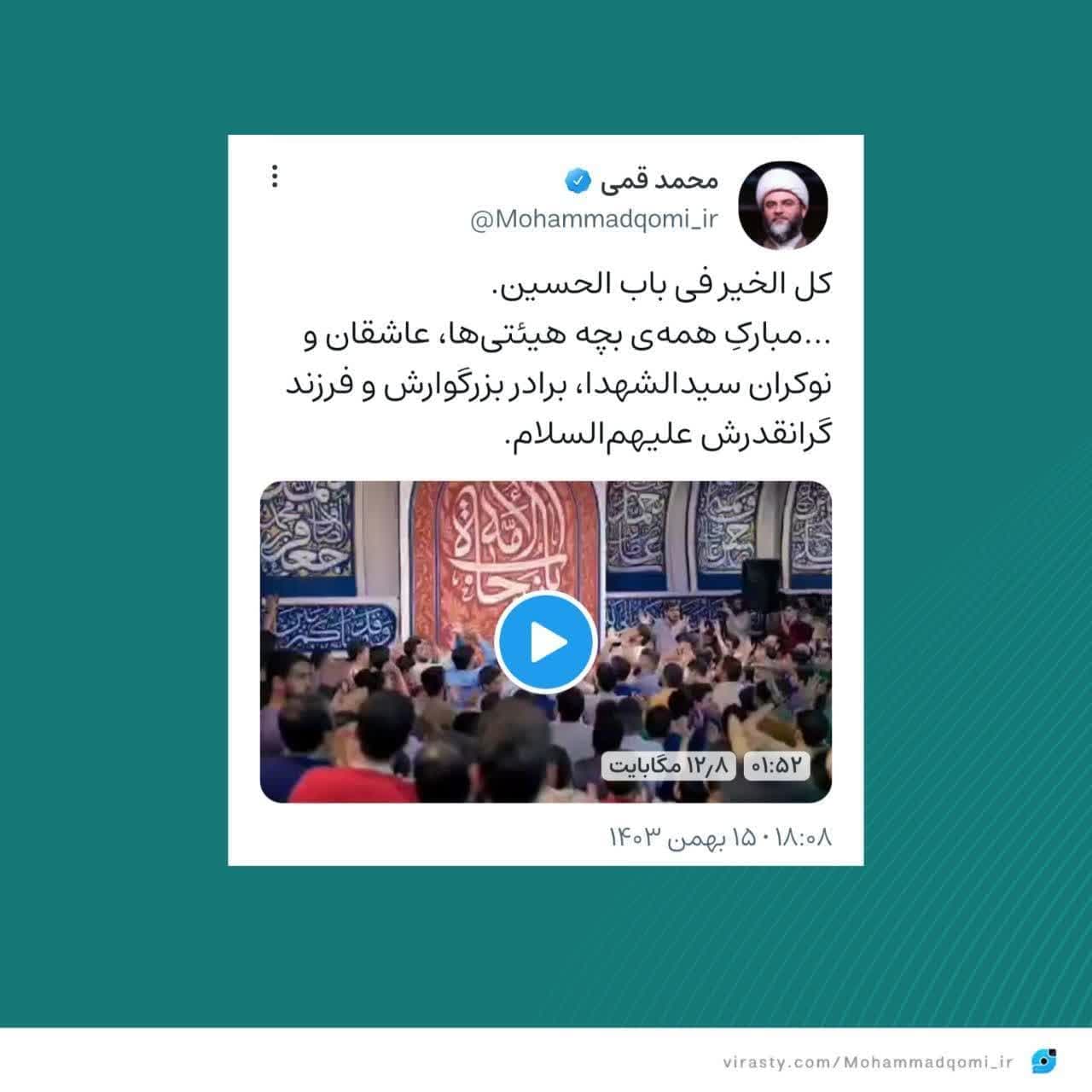 به گزارش روابط عمومی سازمان تبلیغات اسلامی، حجتالاسلام محمد قمی، رئیس سازمان تبلیغات اسلامی به مناسبت اعیاد شعبانیه در صفحه شخصی خود در شبکه اجتماعی ویراستی فیلمی از مولودی خوانی حاج مهدی رسولی منتشر کرد.