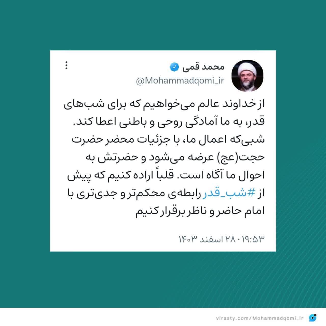 به گزارش روابط عمومی سازمان تبلیغات اسلامی، حجتالاسلام محمد قمی، رئیس سازمان تبلیغات اسلامی به مناسب شب قدر در شبکه اجتماعی ویراستی متنی منتشر کرد.