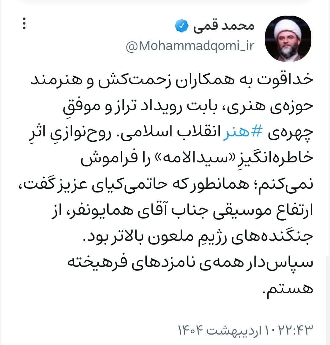 به گزارش روابط عمومی سازمان تبلیغات اسلامی، حجتالاسلام محمد قمی، رئیس سازمان تبلیغات اسلامی پس از برگزاری اختتامیه هفته هنر انقلاب اسلامی با انتشار متنی در صفحه شخصی خود در شبکه ویراستی از فعالین در حوزه هنری تقدیر و تشکر کرد.